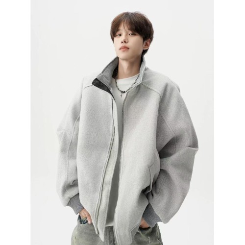 灰色の輪郭感ある短丈アウター、男性用冬物立て襟綿入りジャケット。高級感ある厚手仕様
